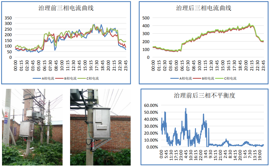 杭州某居民配電臺區三相不平衡問題突出,變壓器損耗嚴重,人工治理后沒多久又出現不平衡的現象,給運維造成極大的不便,經過治理后三相不平衡問題得到解決。