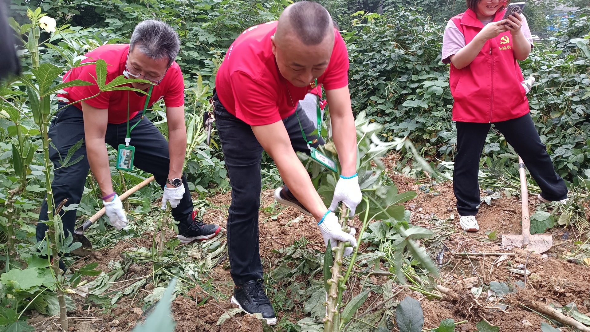 為祖國母親慶生之后,宇諾科技黨員服務隊前往庭院進行勞作。隊員們拿起鐵鍬,幫助清理菜園子,將枯死的秸桿鏟除清到外面。