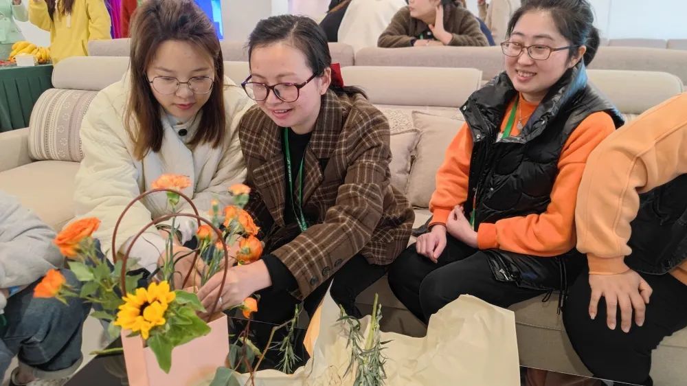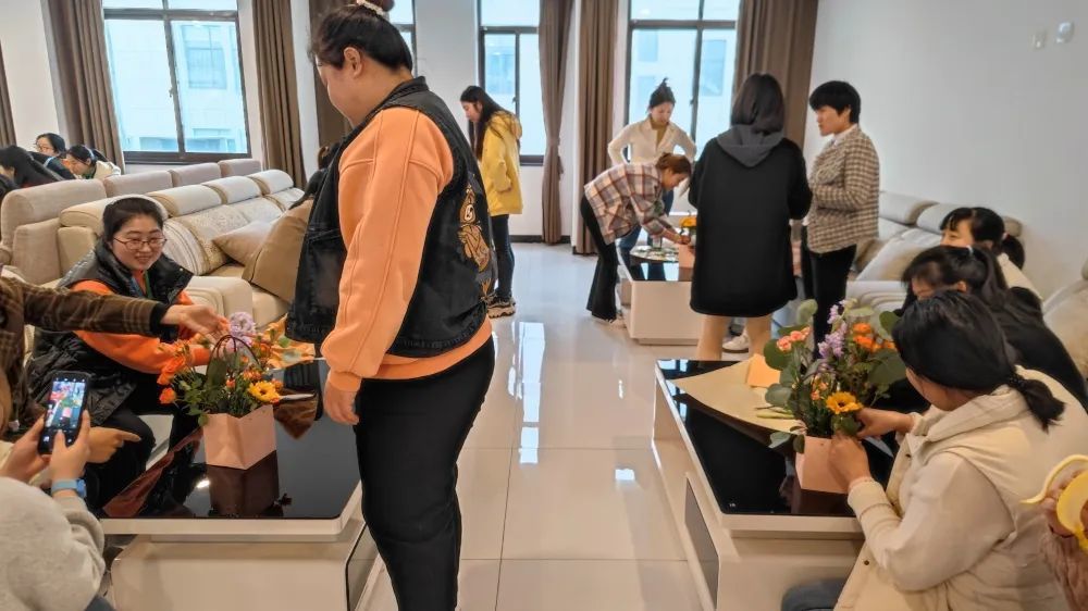 一枝枝小雛菊、向日葵等經過女同胞們的巧手修枝剪葉,巧妙的創意組合,勾勒出一籃籃錯落有致、色彩鮮艷的插花作品,寄托著女同胞們對美的理解和對幸福的感悟。